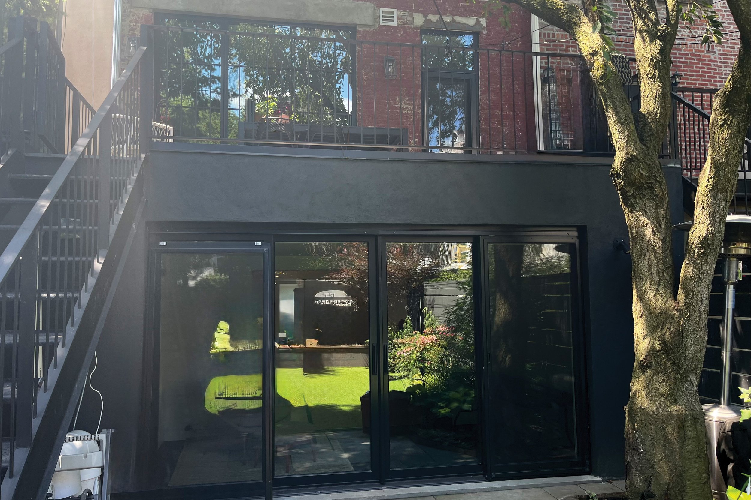 The garden-level of this two-family townhouse was gut renovated to afford a more purposeful living space for this Brooklyn family. The cellar floor was dug out, to lower it a foot and a half, providing enough ceiling height to allow it to be reimagined as a home gym. On the garden level, an extension was added to the back. The apartment was renovated to be a flexible living and recreation space with a custom kitchen & office. The office, with its large 12-foot wide sliding doors and custom designed built-in drop-down bed, is easily used as a guest room. A wall of windows, looks out to the landscaped back garden. The roof of the extension, off the upstairs kitchen, has a beautiful new deck with stairs to access the garden.