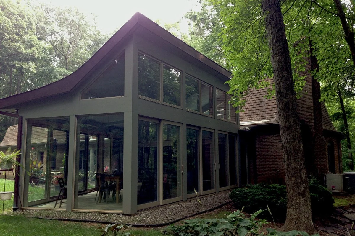 After over thirty-five years of living in their home, the clients wanted to renovate the kitchen and expand their dining capacity. They envisioned a space which could accommodate dinners with their growing extended family and as well as being a beautiful environment to host parties. As avid home chefs, they wanted a customized kitchen with efficient workspaces conducive to gathering and spending time with family and friends while preparing meals. The light-filled addition was designed to accommodate a large dining table and chairs with views of the forest at one side and the English garden on the other. The sloped roof is a formal response to the gabled roof of the existing house and serves to frame the beautiful views all around.